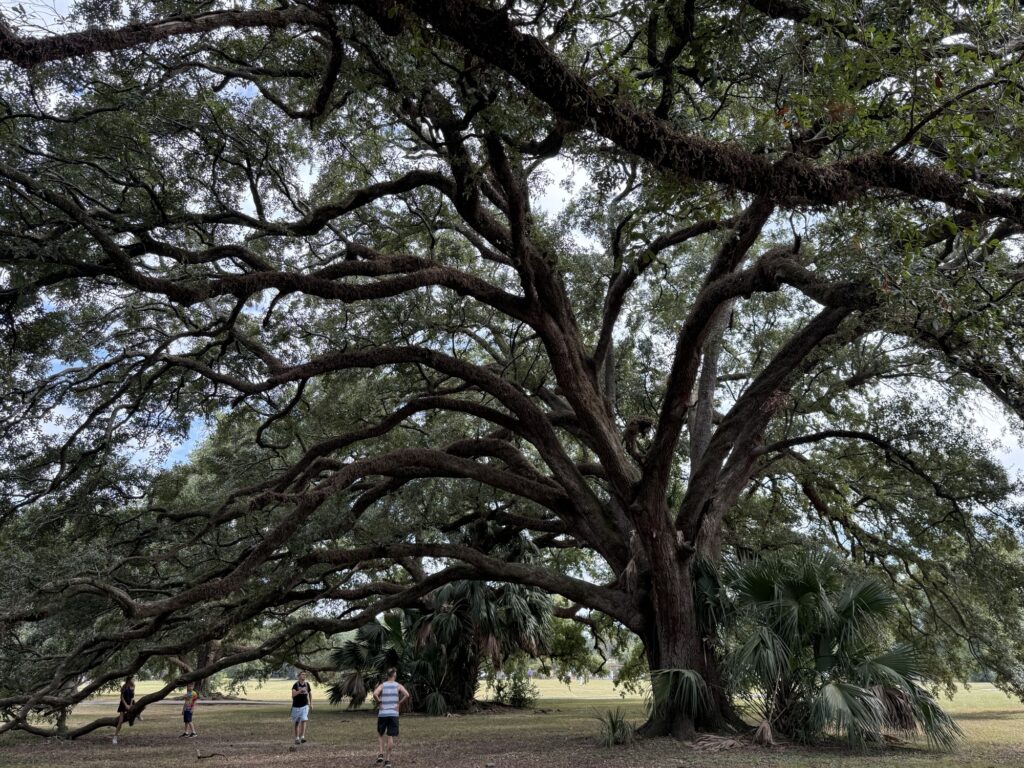 Next we headed to City Park. It’s bigger than Central Park in New York, and it contains the highest point in the City of New Orleans at 27 feet above sea level. The park’s website jokes that oxygen and sherpas are available for those who want to scale the peak. The park is full of colossal, gorgeous, old oak trees dripping with Spanish moss. Here’s a pic of the first one we found on entering the park, with kids in the lower left corner for scale.