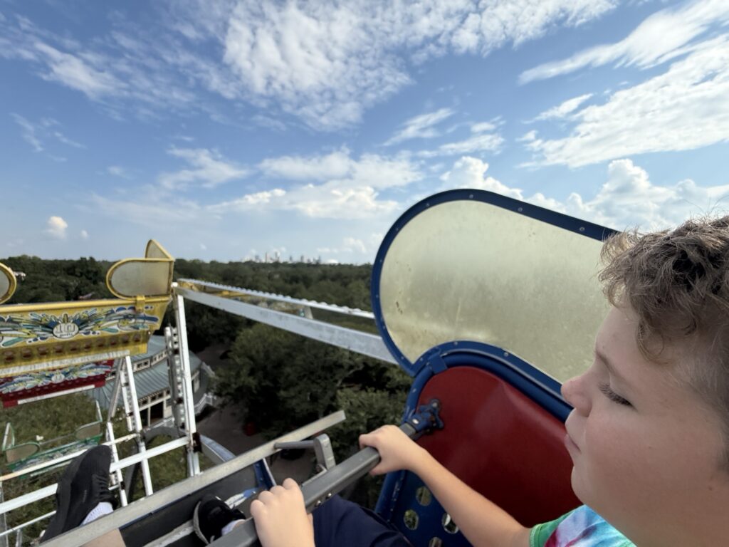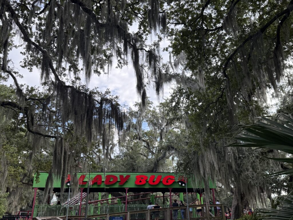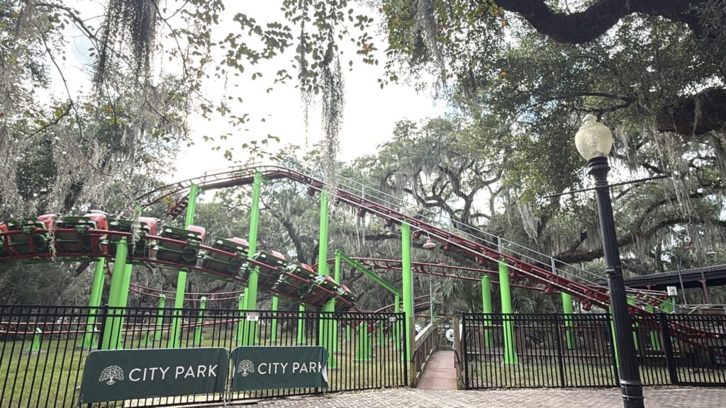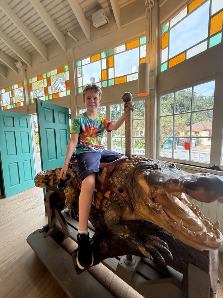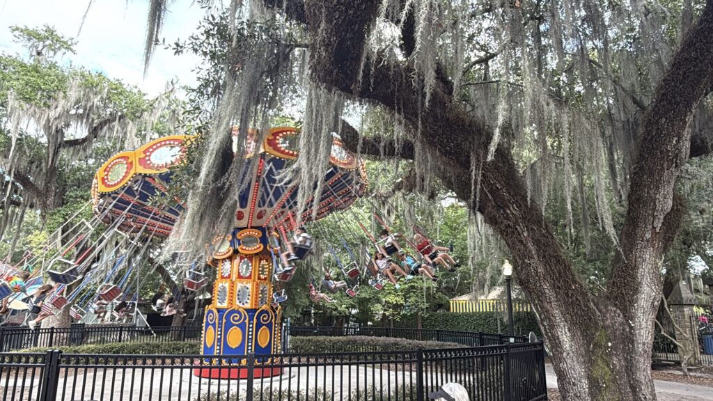 We went to Carousel Gardens, a little amusement park inside City Park. It’s tiny and inexpensive, and a lot of the rides are geared toward much younger kids than ours, but we found plenty to do. There was a little roller coaster, some swings, bumper cars, a Ferris wheel, and a tilt-a-whirl. Interspersed through the park were more gorgeous oak trees.