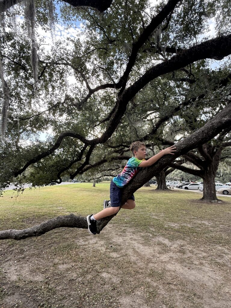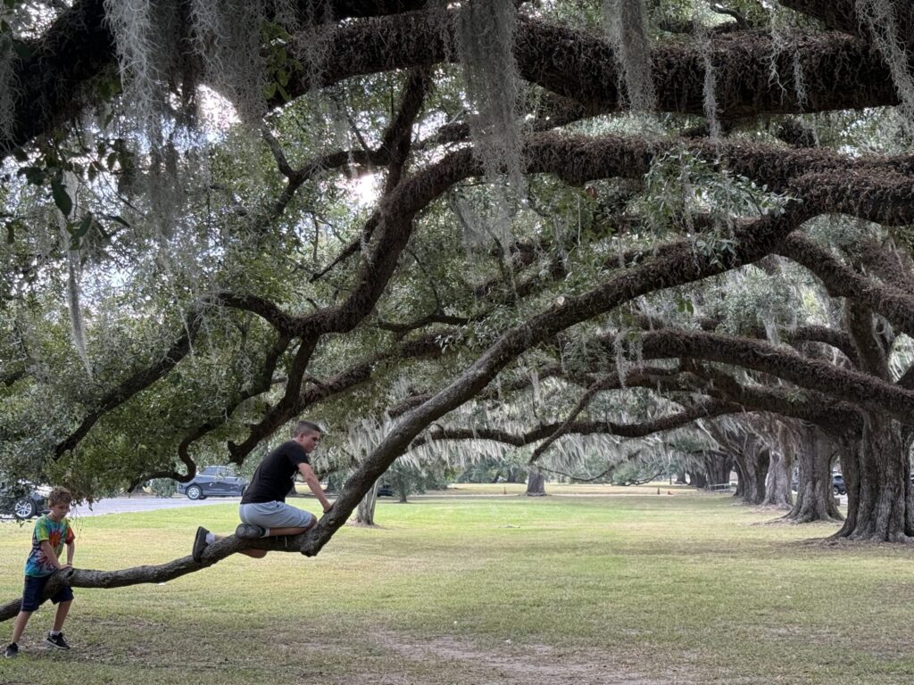 We just could not get over how beautiful the giant old trees were, dripping with Spanish moss. On our walk out of the park, we stopped so the kids could climb a bit.